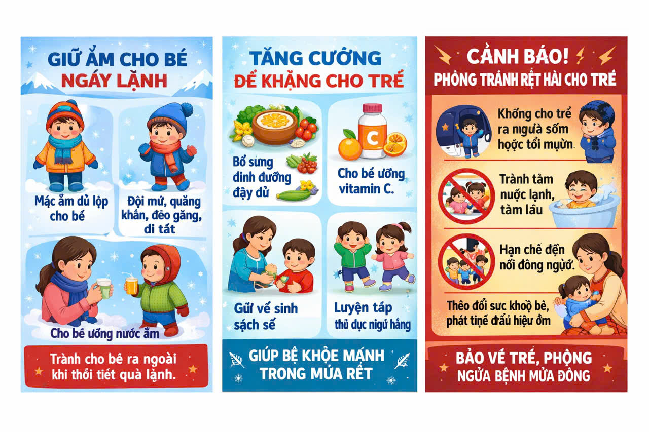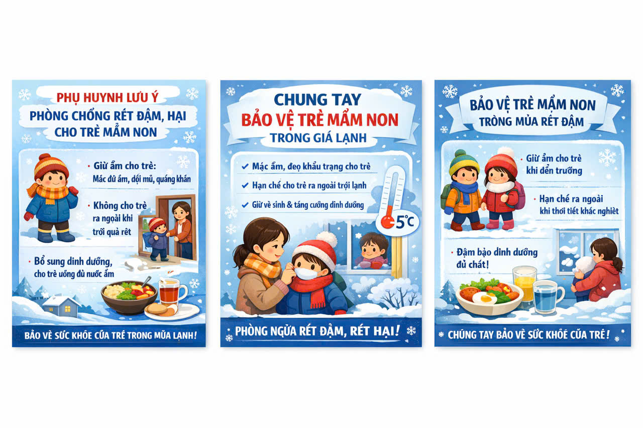 Thực hiện Công văn số 295/UBND-VP3 ngày 16/01/2026 của Ủy ban nhân dân tỉnh Ninh Bình về việc chủ động ứng phó với rét đậm, rét hại và gió mạnh trên biển; tiếp tục triển khai Công văn số 32/SGDĐT-CTHSSV ngày 08/01/2026 của Sở Giáo dục và Đào tạo về việc chủ động ứng phó với rét đậm, rét hại, Trường Mầm non Nhân Mỹ đã và đang tích cực triển khai các biện pháp phòng, chống rét nhằm bảo vệ sức khỏe cho trẻ. Nhà trường chỉ đạo cán bộ, giáo viên, nhân viên theo dõi chặt chẽ diễn biến thời tiết, chủ động điều chỉnh các hoạt động chăm sóc, giáo dục cho phù hợp trong những ngày giá rét. Các lớp học được đảm bảo kín gió, ấm áp; trẻ được mặc đủ ấm, đội mũ, đi tất khi đến trường. Chế độ ăn của trẻ được tăng cường các món ăn nóng, giàu dinh dưỡng nhằm nâng cao sức đề kháng. Giáo viên chú trọng giữ ấm cho trẻ trong các hoạt động sinh hoạt, ngủ trưa và hạn chế tổ chức hoạt động ngoài trời khi nhiệt độ xuống thấp. Nhà trường phối hợp chặt chẽ với cha mẹ trẻ trong việc chăm sóc, theo dõi sức khỏe của trẻ tại gia đình và tại trường. Công tác vệ sinh môi trường, phòng chống các bệnh thường gặp trong mùa đông được thực hiện thường xuyên, nghiêm túc. Các biện pháp phòng, chống rét được triển khai đồng bộ, kịp thời, phù hợp với điều kiện thực tế của nhà trường. Qua đó góp phần đảm bảo an toàn, sức khỏe cho trẻ, giúp trẻ yên tâm học tập và vui chơi trong những ngày thời tiết rét đậm, rét hại.